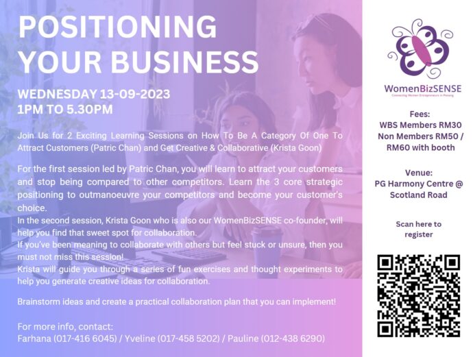 Join Us for 2 Exciting Learning Sessions on How To Be A Category Of One To Attract Customers (Patric Chan) and How To Get Creative & Collaborative (Krista Goon) on 13 September 2023, WEDNESDAY at Penang Harmony Centre, Scotland Road, Penang (1pm to 5pm).